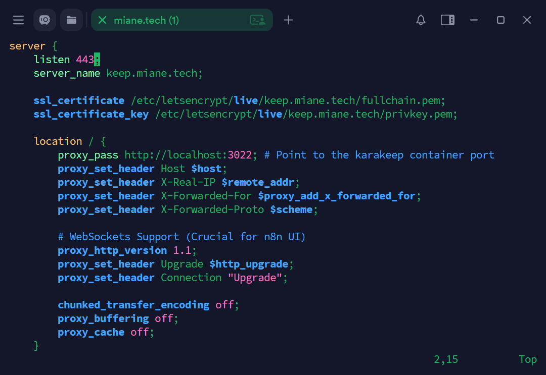 To handle the incoming traffic, I created a new virtual host configuration in Nginx:sudo vi /etc/nginx/sites-available/keep.miane.tech.conf