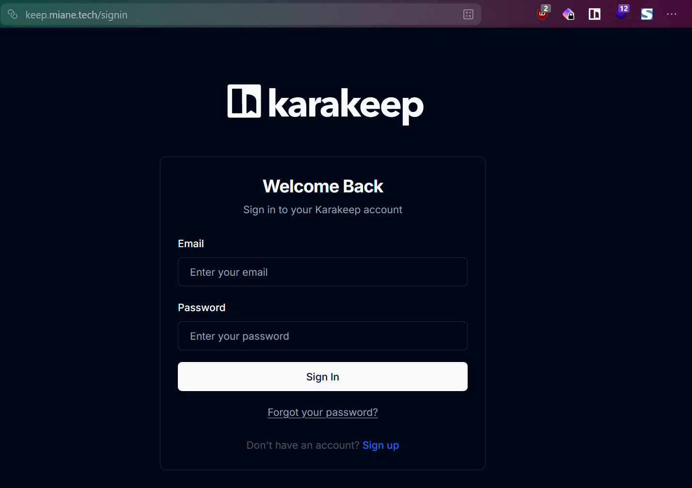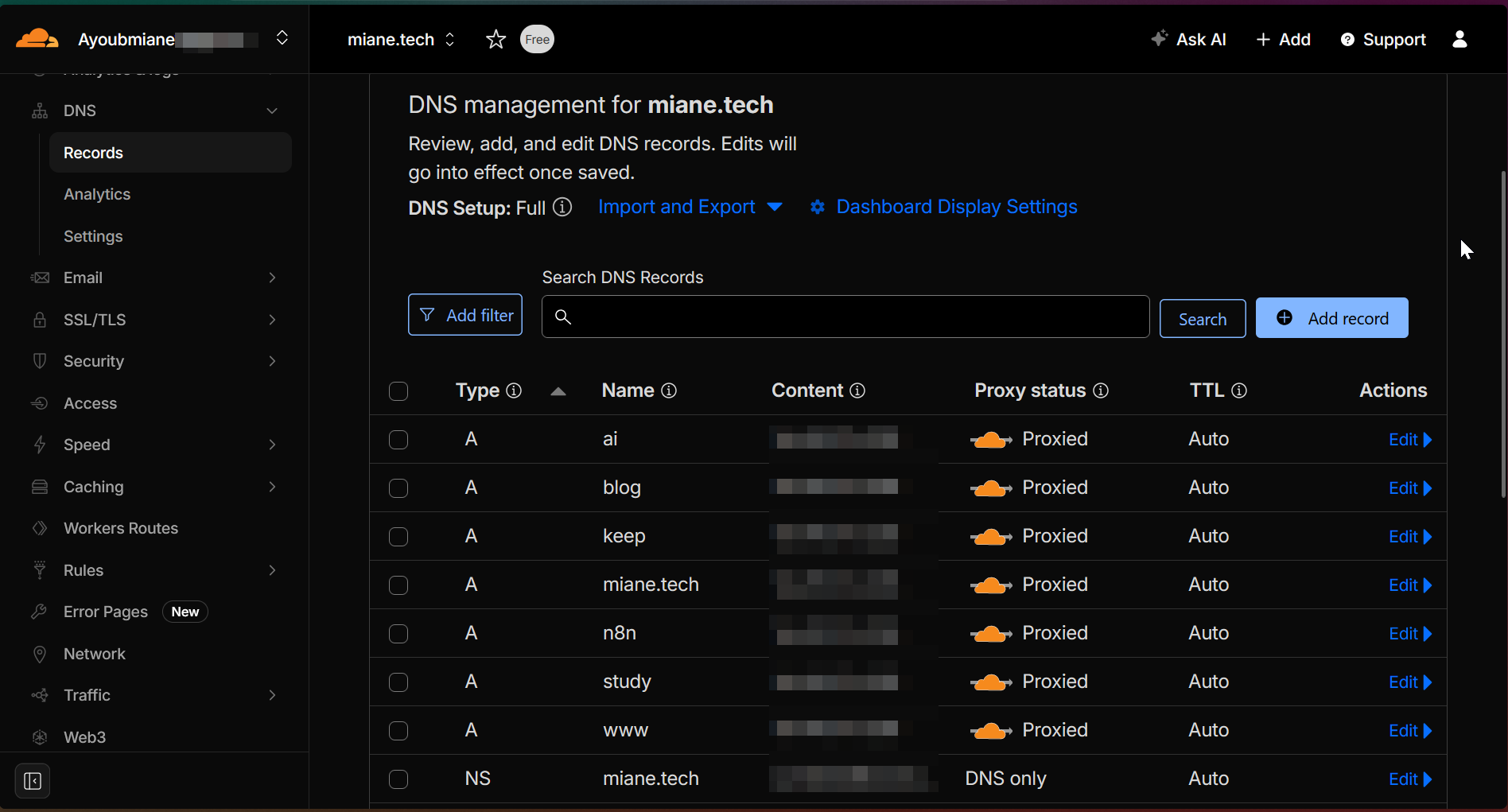 I started by creating a new A record for keep.miane.tech in Cloudflare, pointing it directly to my server IP.