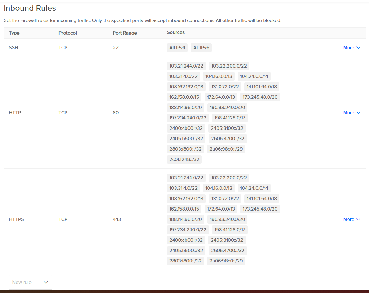The final, and most important step, was hardening the DigitalOcean firewall. I configured it to drop all traffic except for requests coming from Cloudflare's IP ranges. This "hides" my origin server IP from the public internet and prevents direct-to-ip attacks.